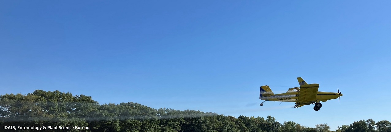 Aircraft typically begin treatment at daybreak and continue until complete. Flying low to target tree canopy, low-flying aircraft can be seen and heard for a period of time. The GPS-equipped aircraft treat targeted treatment sites while making numerous passes, flying approximately 100-200 feet above tree canopy. Treatment dates depend on insect development, weather conditions, and the stage of the insect targeted. Treatment plans are subject to change up to the last minute due to weather conditions. The most up-to-date scheduling of treatment is available by listening to a pre-recorded message on the IDALS spongy moth treatment Infoline or by visiting this website during treatment years.